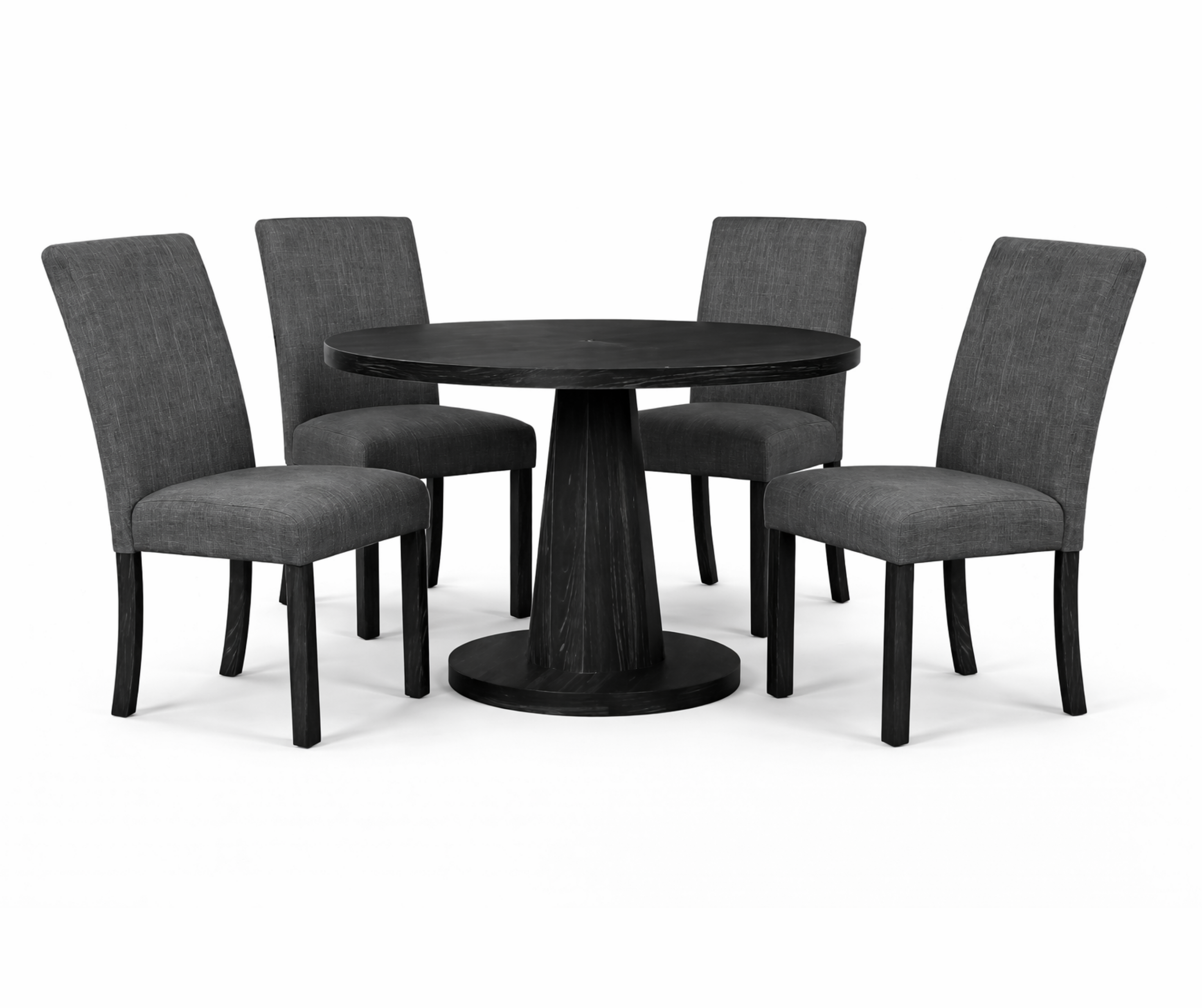 A round wooden dining table set designed for casual and modern dining spaces.